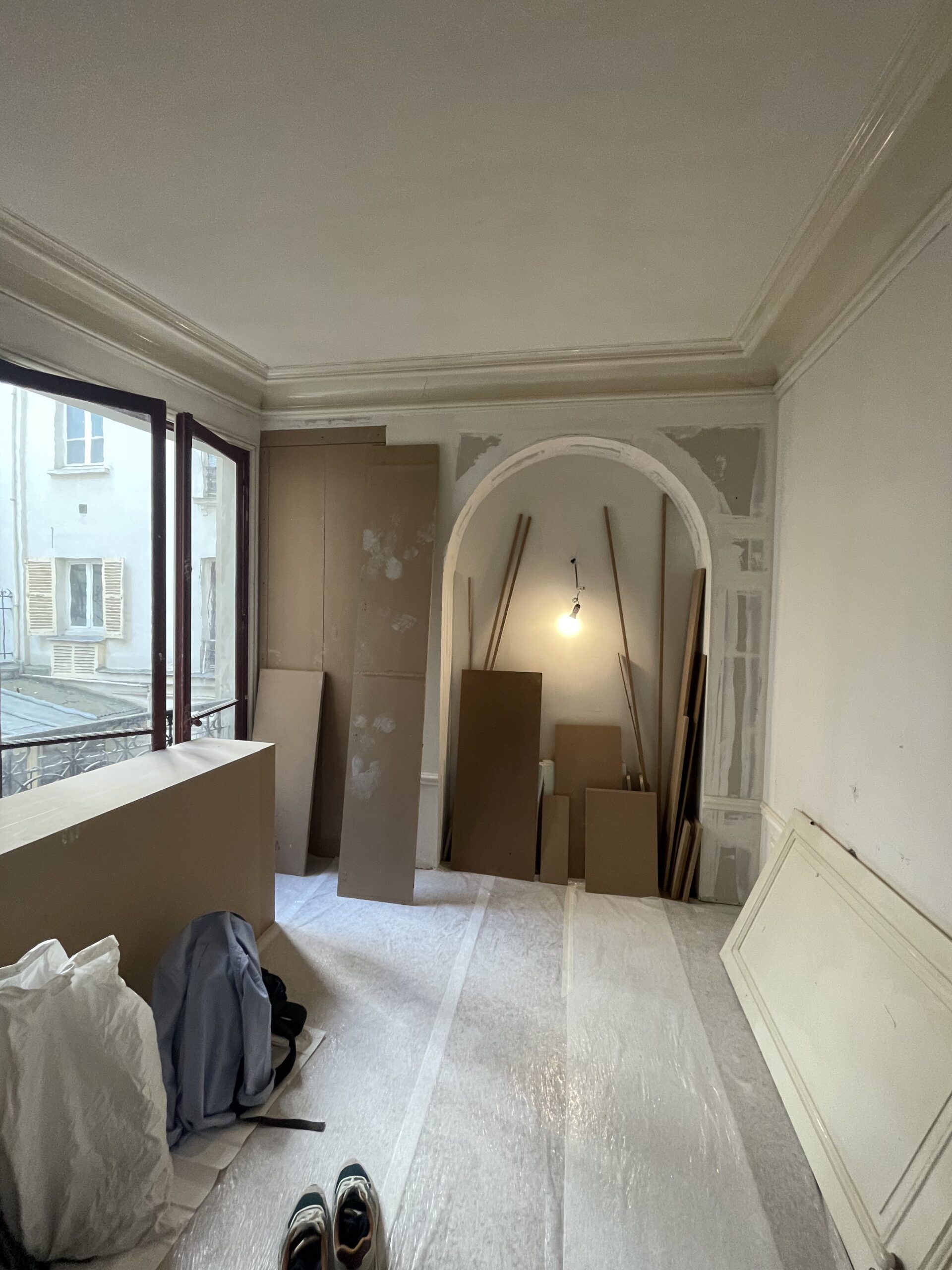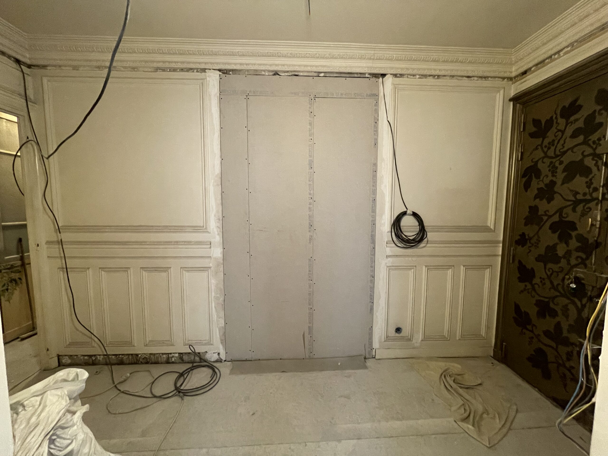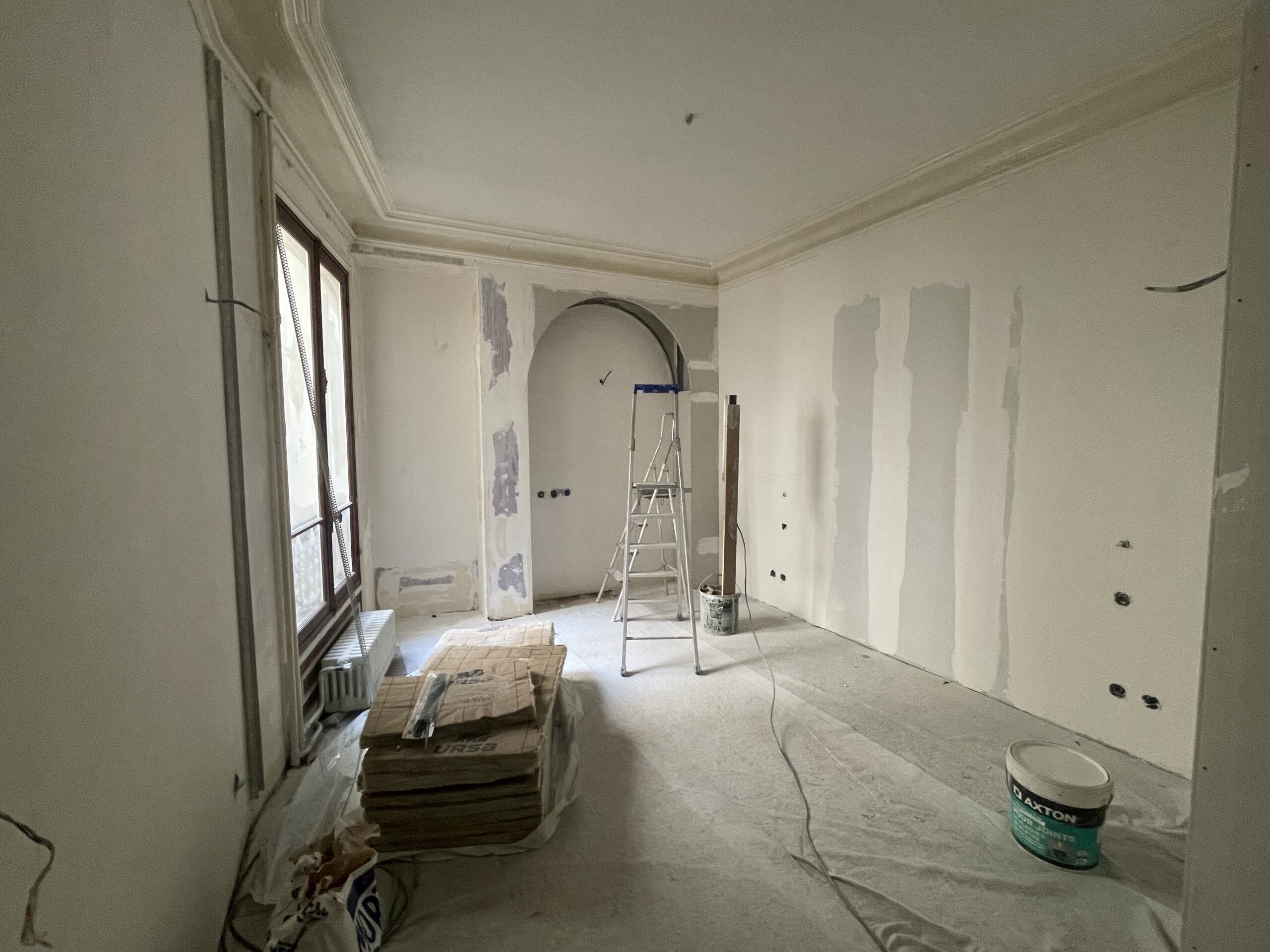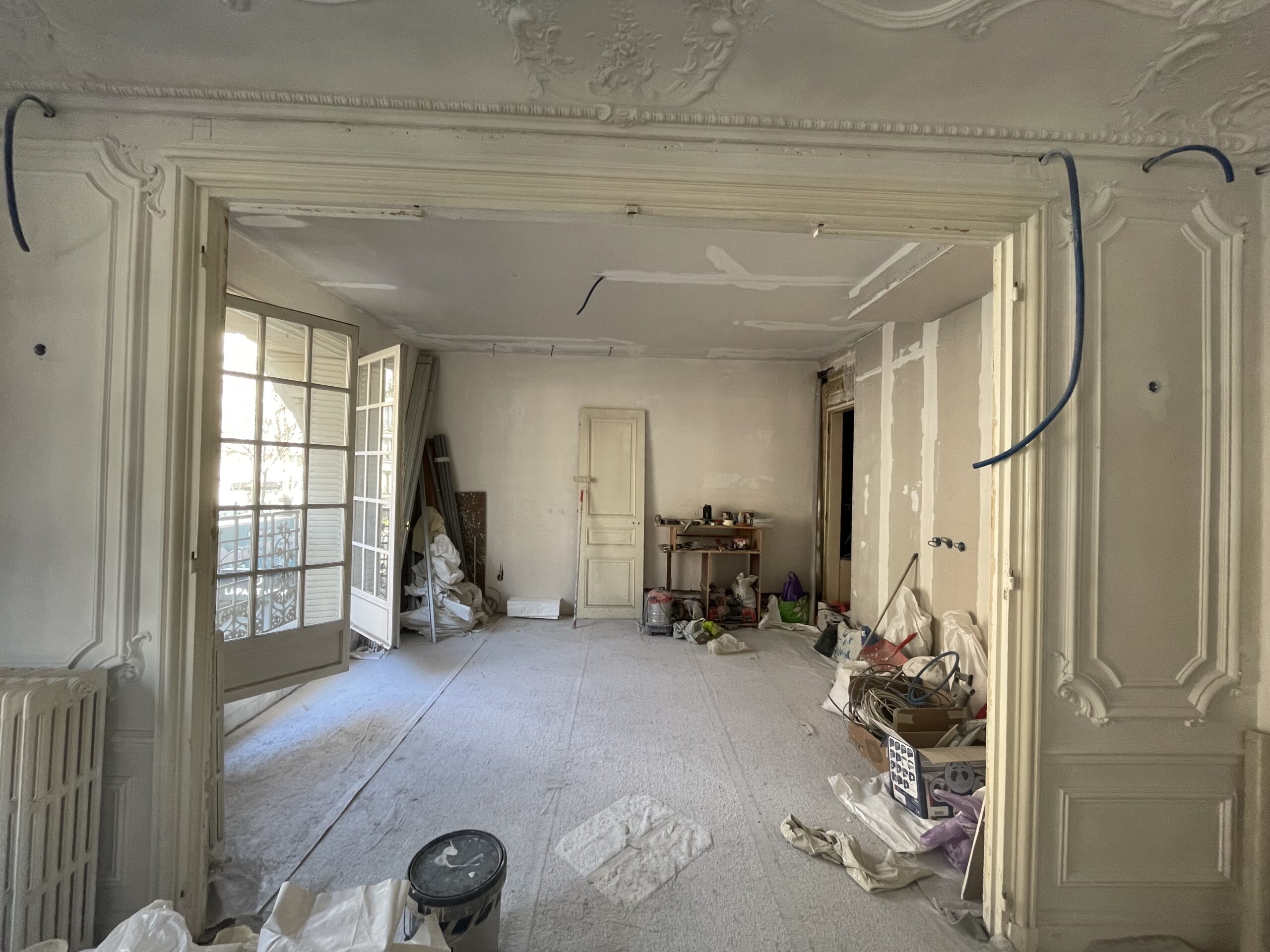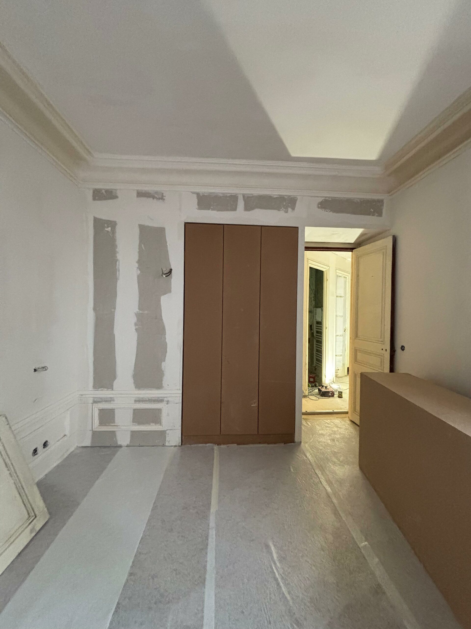 La modification du cloisonnement a nécessité la reprise des moulures : notre staffeur a reproduit les anciennes corniches à l’identiques sur les nouvelles cloisons. Des nouvelles cimaises ont également été ajoutées ou reprises, de manière à conserver les lettres de noblesse de cet appartement haussmannien.