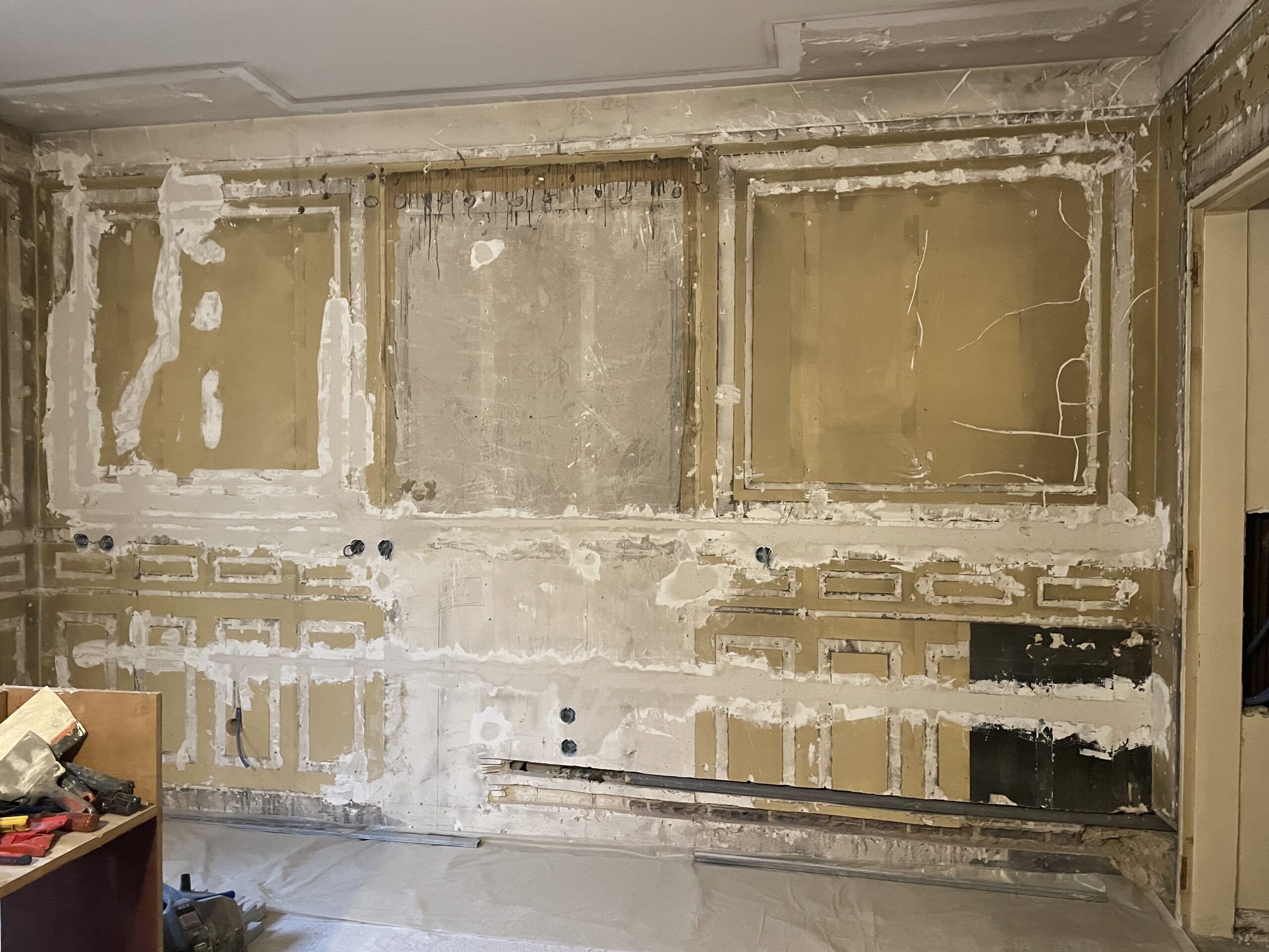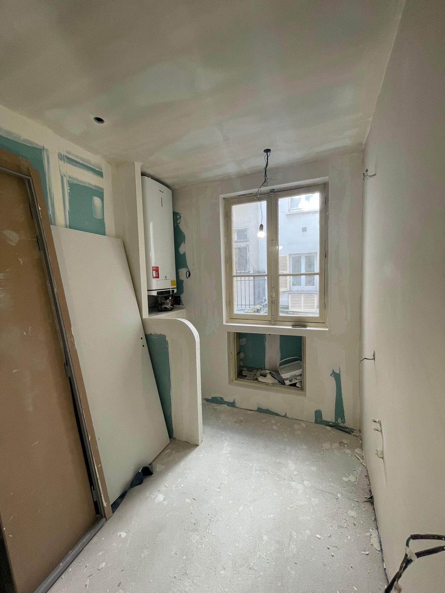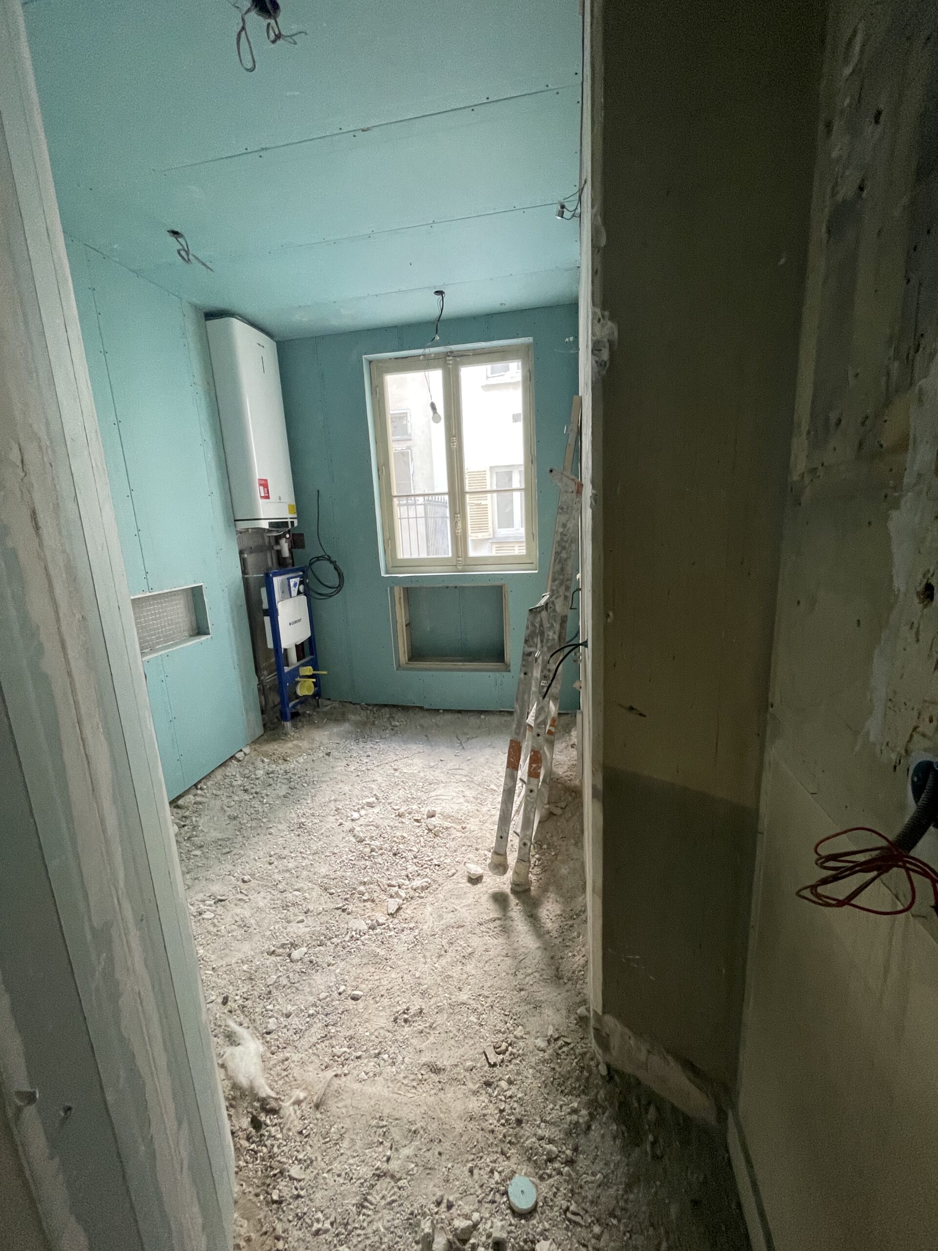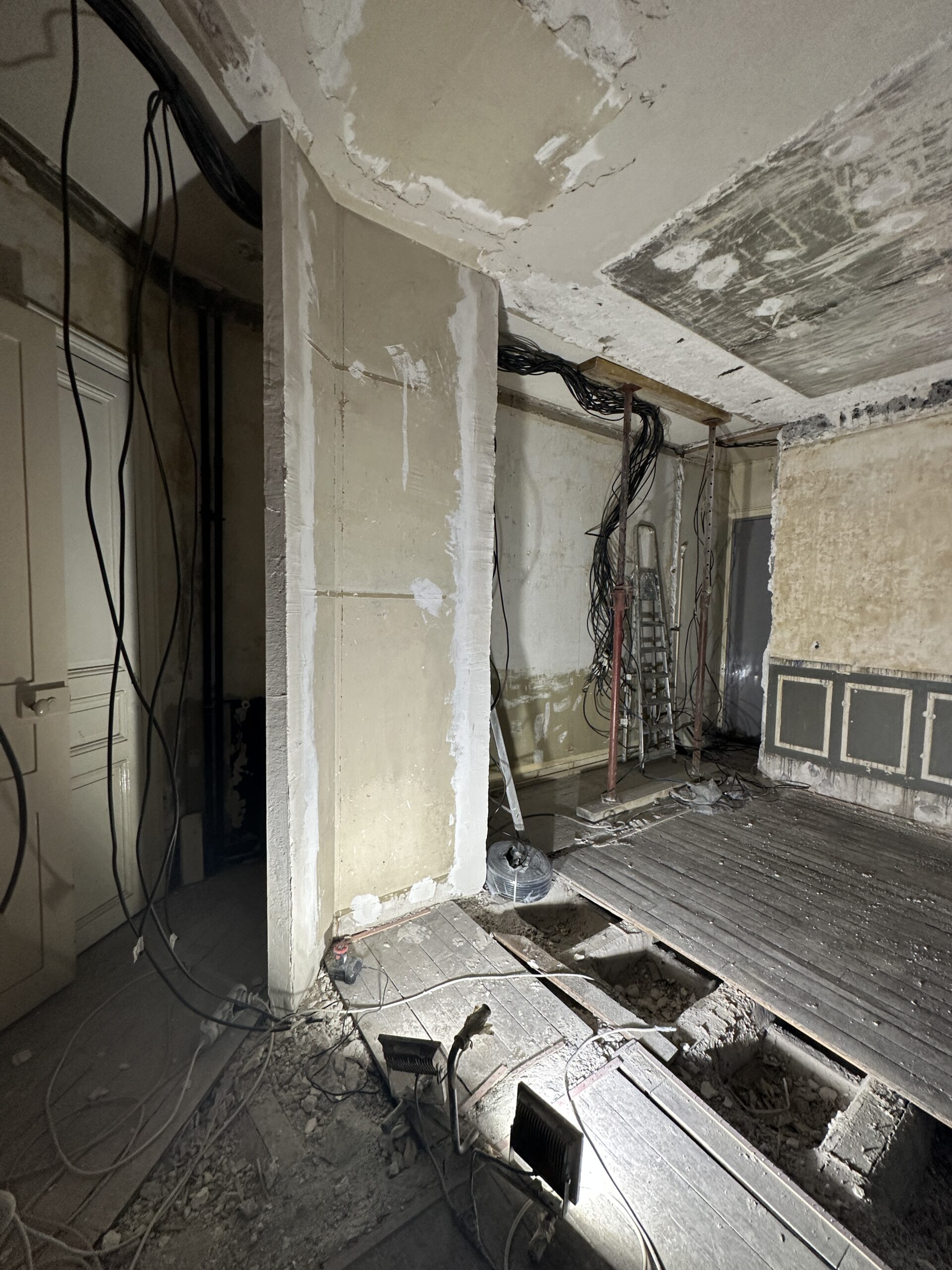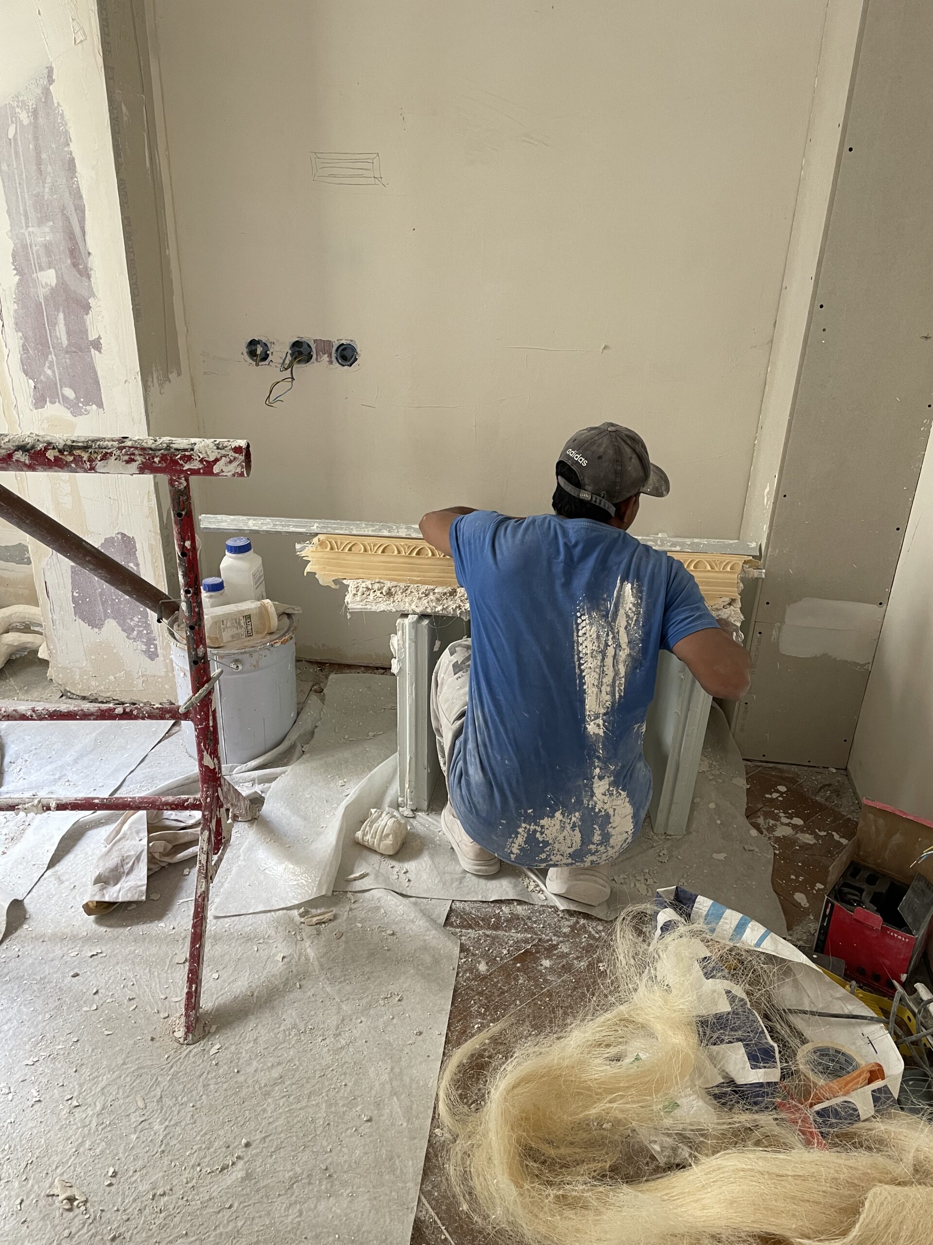 La modification du cloisonnement a nécessité la reprise des moulures : notre staffeur a reproduit les anciennes corniches à l’identiques sur les nouvelles cloisons. Des nouvelles cimaises ont également été ajoutées ou reprises, de manière à conserver les lettres de noblesse de cet appartement haussmannien.