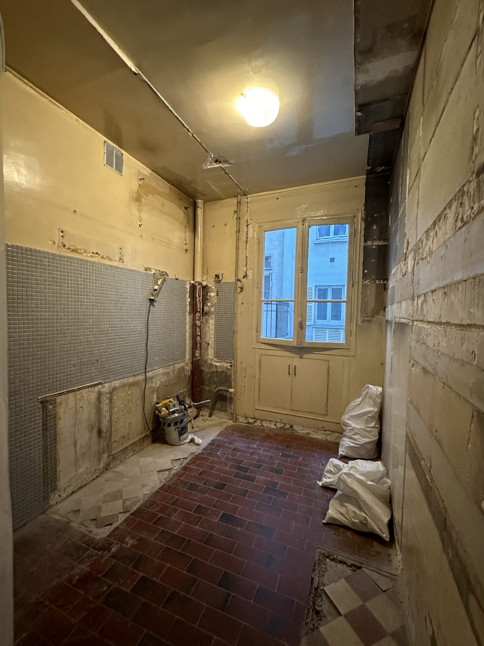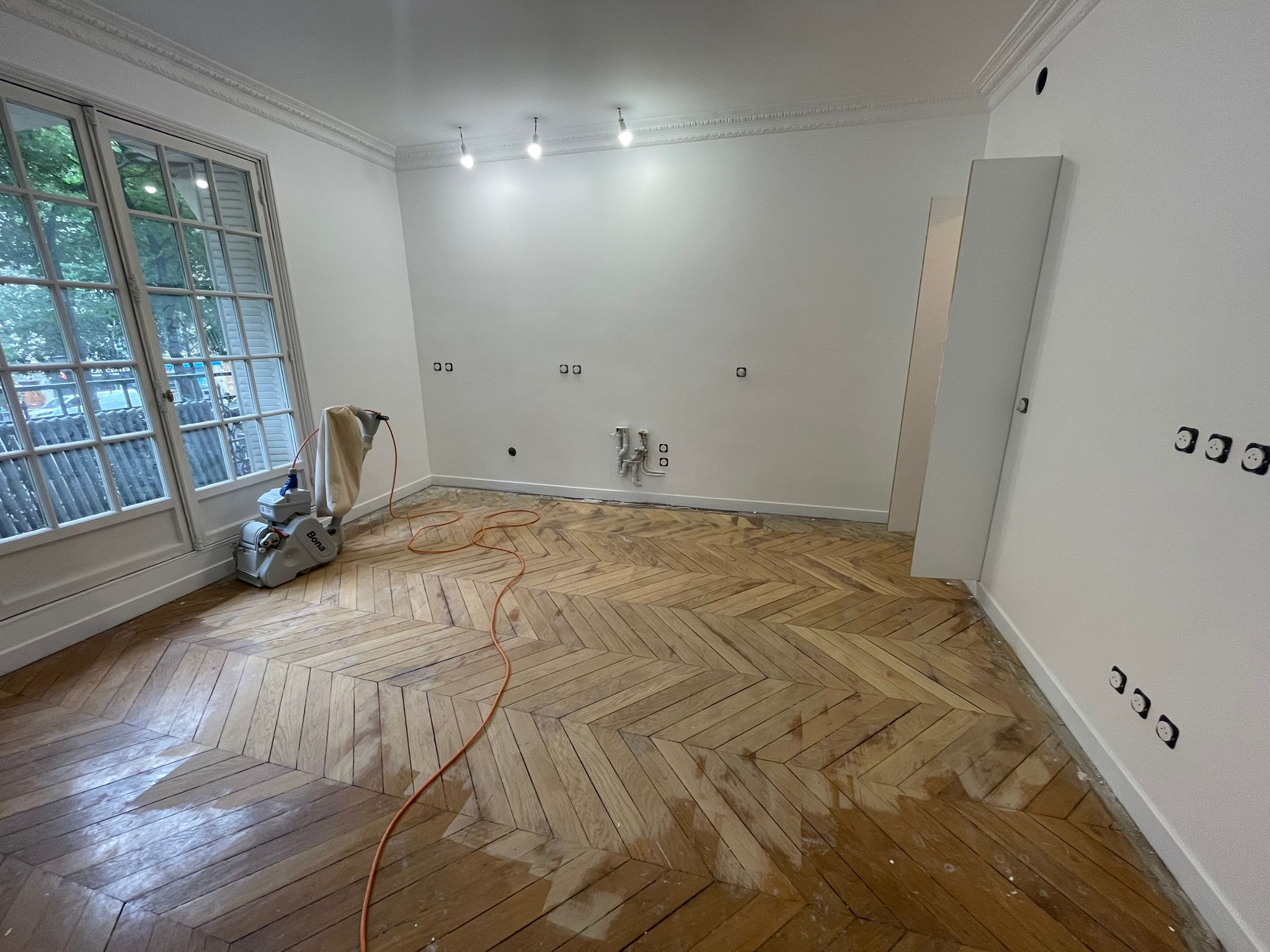 Le parquet des pièces de vie, en point de Hongrie, était en très bon état et n’a nécessité qu’un ponçage-vitrification et le remplacement de quelques lames. Côté chambres et couloir, il était malheureusement trop abimé et a été remplacé par un parquet contrecollé de même essence et teinte que le parquet ancien.